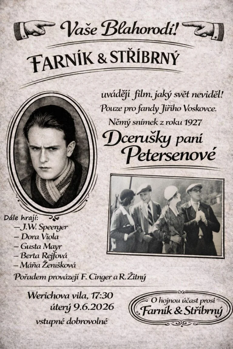 na promítání ne moc známého snímku Dcerušky paní Petersenové aneb Láska prochází žaludkem. Film byl v letech 2008-2010 rekonstruován v NFA a v roce 2026 Farník & Stříbrný digitaliozován.